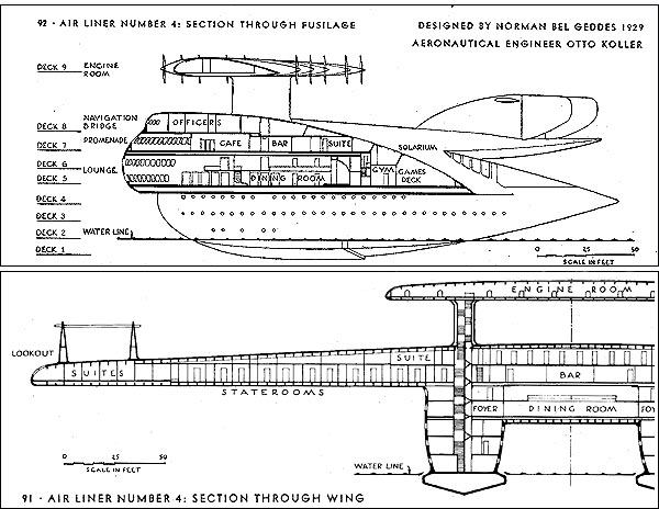 Pada tahun-tahun perang, pesawat-pesawat terus dibuat makin besar. Konsep dahsyat seperti Norman Bel Geddes Airliner Number 4 muncul, dengan 9 dek akomodasi hotel mewah, bar, dan ruang-ruang mesin: